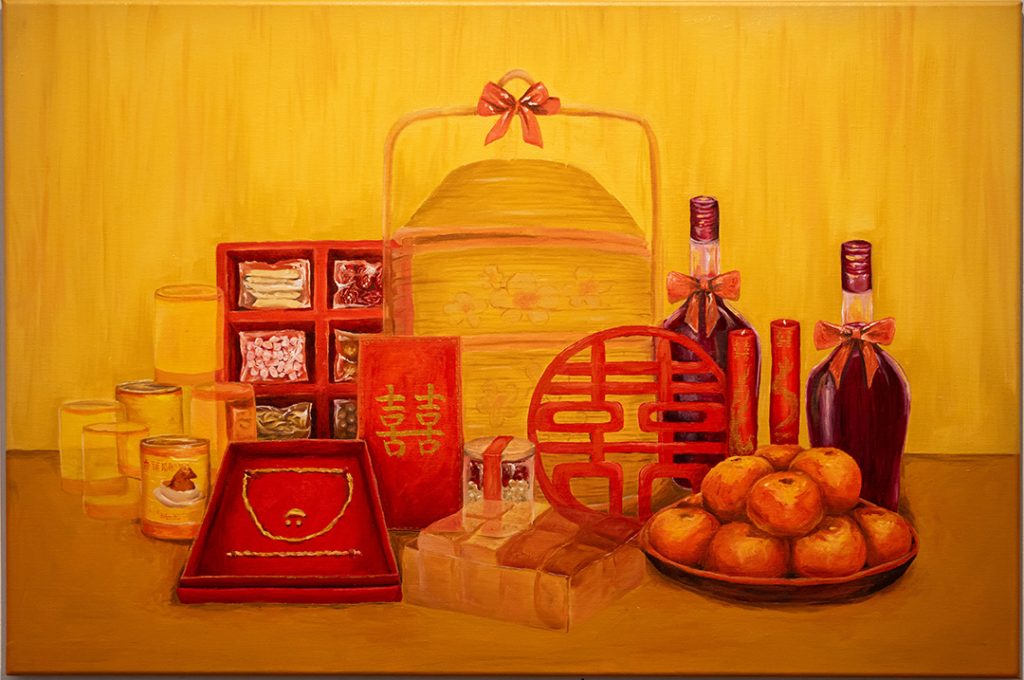 Chinese betrothal gifts, inspired by those from a Chinese wedding, are set as a still-life composition to mark the formal union of a marriage. Translucent forms, paired with muted colours and diminished details contrasts the prosperous warm analogous colours. This suggests the fading and loss of such traditional practices. Each blended brushstroke conveys the softness of nostalgia, framing this work as a visual archive for the family union and Chinese culture.
