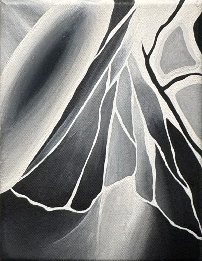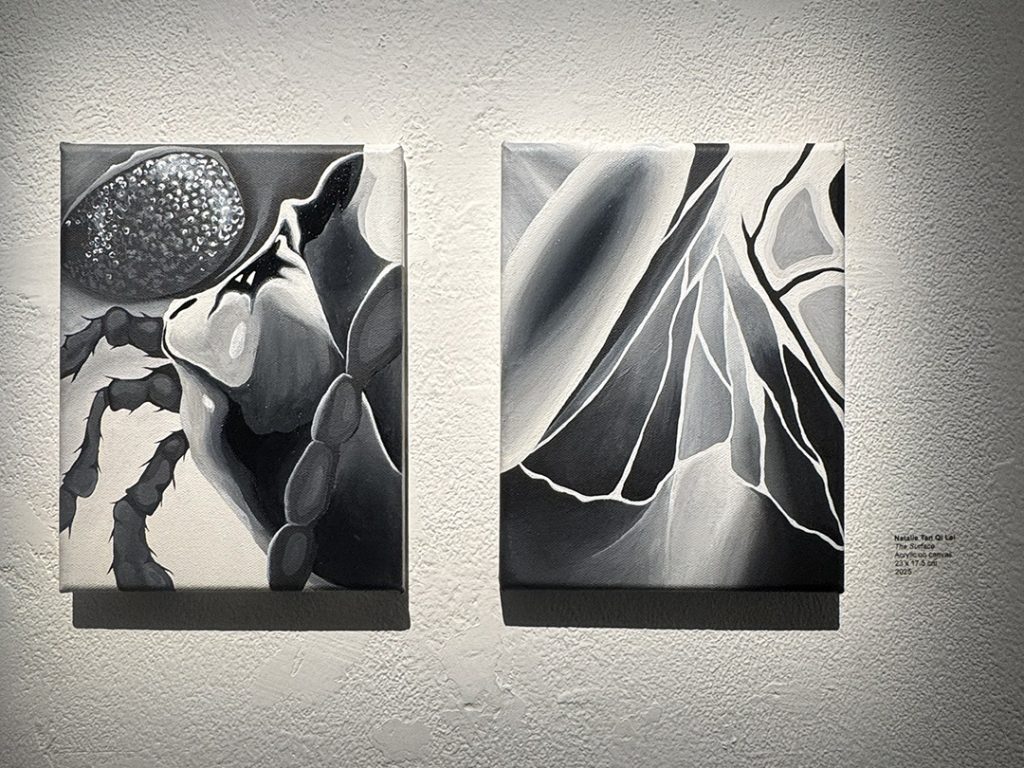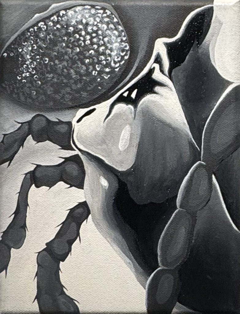 The Surface is a black-and-white series of two paintings depicting a magnified view of a large green chafer beetle. This artwork aims to portray the beauty of the insect through an abstract composition of its anatomy, emphasized by the use of lines and tonal contrast. The elytra in each painting is coated with a layer of gloss to replicate the natural shine of the beetle’s shell. Furthermore, the small scale of the painting reflects the creature’s simplicity and diminutive size, thereby amplifying its uniqueness and beauty.